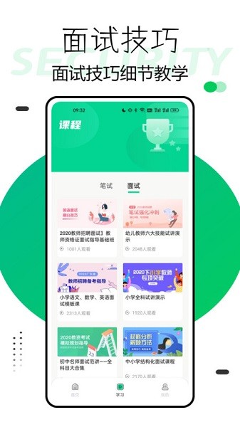 在学习页面,我们精心为您准备了优质课程,涵盖笔试与面试两大板块,内容丰富、深入浅出。通过视频学习,您可以轻松掌握考试要点,提升应试能力。选择中师智学,让您的教师之路更加顺畅!