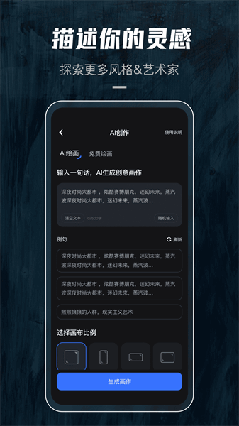 炫景是一个可以描述画面进行绘画的工具,输入文案,ai智能绘画工具软件,既可生成想象中的幻画面。你想要的应有尽有,快来炫景大展风采吧!