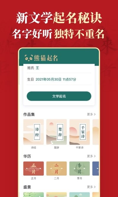 诗词起名,熊猫起名app全面涵盖经典文学作品,找出有内涵/有格调的好名字。