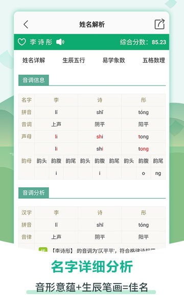 这个软件还支持在线支付和大师服务,随时可以咨询专家,真的很贴心。名字的测试结果也很详细,包括音律、字形、文化深度这些因素,让人觉得专业又靠谱。