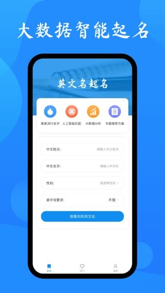 英文名起名取名助手正式版app可以帮助用户起英文名,这里有非常详细的英文名热度排行榜,精选国外流行的男女生英文名,可以根据中文名来智能匹配相对应的英文名,有非常贴心的大数据分析,每个英文名还有非常详细的解释。