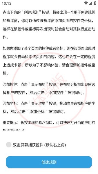 如果想要实现自动关闭某些弹窗或其他自动点击动作,请根据情况自定义规则,如添加关键字或添加坐标或添加控件,本应用不预设除跳过开屏广告之外的其他操作。