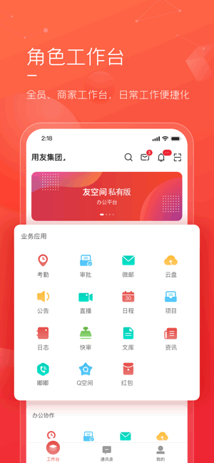 友空间专属版即友空间私有版,适用于服务部署独立化场景。打造线上工作台,提供考勤、审批、云盘、公告、日程、项目、文库、资讯等业务服务,最新通知消息实时掌握了解,及时处理待办任务,随时通讯交流,沟通方便,多人协同,高效办公!