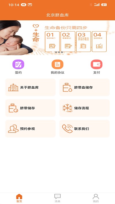 北京市脐血库软件是一款北京地区官方脐血库服务的健康医疗服务平台,用来日常监督管理脐带学存储,支持在线预约参观,储存流程便捷高效,操作简单,一键签约,手机支付缴费,轻松查询,十分方便,有需要的伙伴快来体验吧!