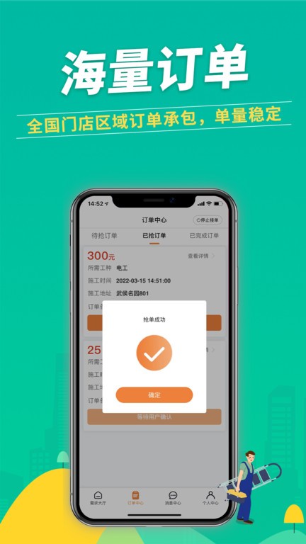 这个app不仅功能强大,还特别贴心。比如,支持一键接单、订单分类、消息提醒这些功能,让工作变得井然有序。最棒的是,它还能让工人根据自己的时间和距离来自主报价,完全不用担心被压价。