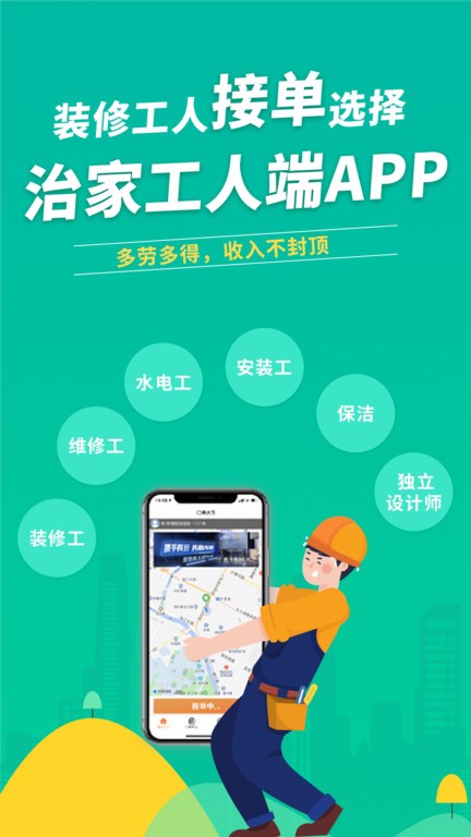 治家工人端,是治家平台旗下专为全国装修工人/独立设计师/工程经理/保洁/安装/维修/测量等师傅群体量身打造的一款即时接单APP,全国有上万装修工人师傅在治家工人端APP上接单,帮助装修、设计、安装、维修等专业技能的工人师傅提高收入,建立个人品牌,实现自我价值。