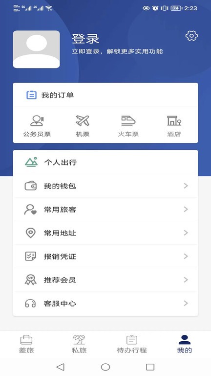 1、点击我的页面,可以在这里查看我的订单、常用旅客、常用地址、报销凭证和推荐会员,点击相应的栏目即可查看