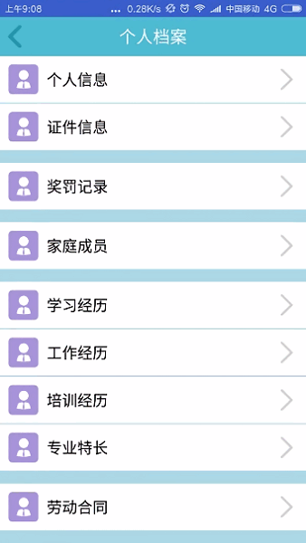 点击个人信息按钮,可以查看个人信息,包括:工作日期、办公电话、个人邮箱、家庭地址、紧急联系人姓名,紧急联系人电话等相关信息。如需完善或修改个人信息中的某项内容,需点击要修改的项目,进入界面后输入要修改的内容,最后点击右上角的√按钮,保存信息。