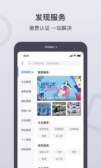 便民生活服务:整合园区周边餐饮、购物、休闲娱乐等商业资源提供线上购买预约服务,以及房屋租赁、招聘就业、拼车出行等其他方便园区人员生活的服务类内容