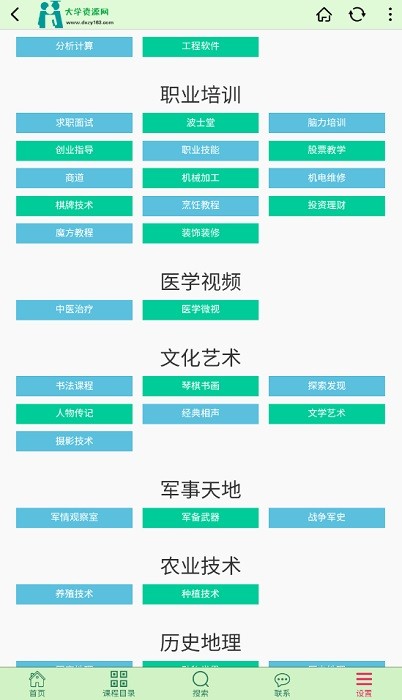 大学资源网app安卓手机最新版包含的课程内容非常之丰富,大学课程方面,包含了主要的专业课程资源,视频讲解非常之详细,可以在线听讲座,同时还有中小学教材知识课程,考研、外语、各类资格考试、职业培训、医学、农业、艺术等课程,适合的范围非常之广泛。
