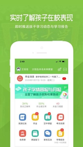 1.新增学情报告,定时推送孩子学习周报与月报;