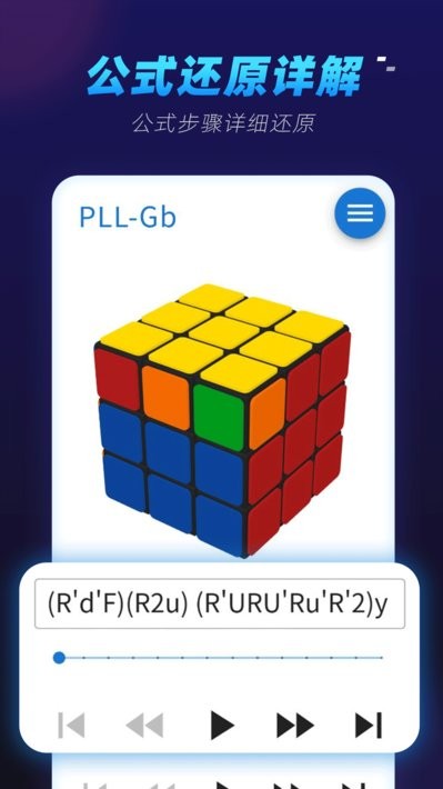 包含f2l、oll、pll等还原公式,选择你想要的公式类型,获得详细公式步骤。