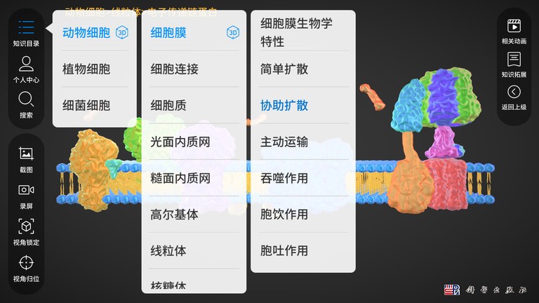 细胞生物学3d资源库系统app最新版融入了3d技术,用户可以直接在手机上查看三维细胞结构,有非常详细的知识目录,能够查看和学习指定内容,在学习的同时能够录像和截图,可以调整视觉位置,包括锁定和归位。