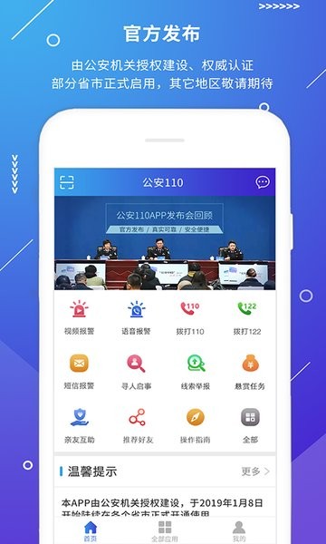 本APP由公安机关授权建设(具体授权单位及文书详见APP内)。如当地公安机关授权并接入本系统,则安装本APP的用户即可在当地使用视频报警等APP功能,亲友互助功能在全国范围内通用。近期接入并开通应用报警服务的有河北全省、湖北首发荆门市、江苏首发张家港市、广西首发河池宜州区、河南首发漯河市、长江航运公安局首发荆州分局,其他省市陆续开通中,敬请期待。