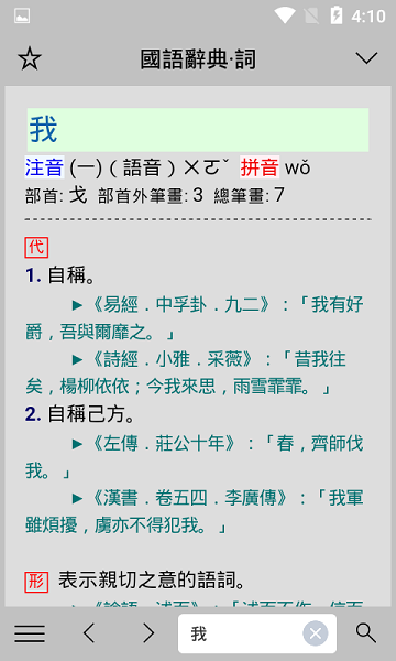 3、辞典功能:说文解字、康熙字典、国语辞典、六书通、中文字典、成语词典、道教大辞典、成语典、汉语大词典、尔雅、国学大师网、百度等等字典,及佛学辞典:佛学大辞典、法相辞典、五灯会元、佛学常见词汇、三藏法数、佛学次第统编、翻译名义集等等,方便快速的搜寻、比较各字典、辞典(词典)的释义,让古文变得通俗易懂。