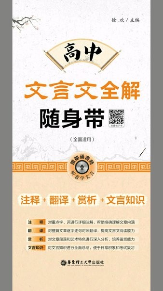 全新的移动端《高中文言文全解》app,在完整还原纸书内容基础上,创造性地引入有声点读功能,邀请名家朗诵古文篇目,增加学习的趣味性,营造良好的文言文学习氛围,随时随地、边听边学,潜移默化中强化你的古文理解能力。