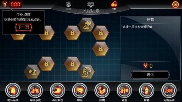 2.玩家需令系统产生相应的疾病,最终令这个人从健康到所有系统衰歇死亡,完成关卡的胜利!