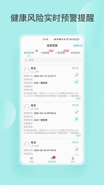 在繁忙的生活节奏中,我们深知健康预警的重要性。因此,本应用确保您能够即时查看每一条健康预警消息,不错过任何可能关乎您健康的细微变化。通过直观的界面设计与智能推送机制,我们助力您迅速响应,高效处理任何潜在的健康风险,为您的健康保驾护航。