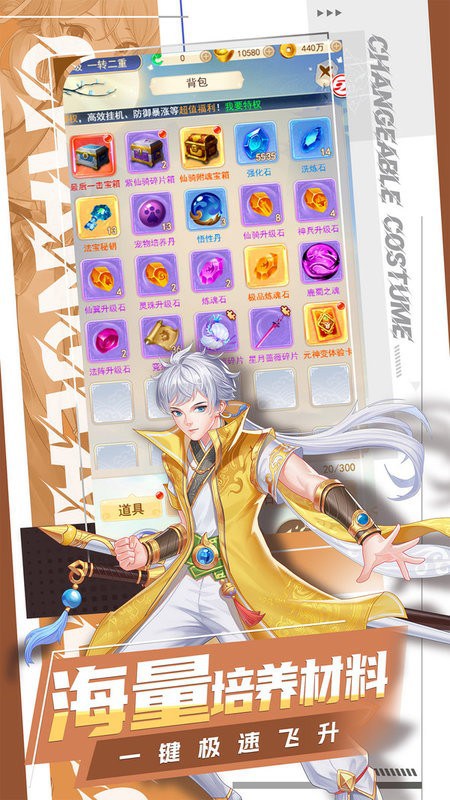 《凡人飞剑》在仙侠游戏的基础设定上,独创的加入了主角变身、多宠物出战、宠物合击等特色玩法!在战斗的危急时刻施展主角变身开启全屏大战逆转战局!挽狂澜于既倒,扶大厦之将倾!还能根据自身宠物属性,自由搭配组合出不同的合击技能!自由玩法,爽快战斗!