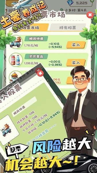 《土豪养成记》是一款模拟经营类游戏,玩家从一无所有的穷小子开始,通过各种投资、贸易和买卖活动,一步步变成富可敌国的大土豪。游戏画面卡通有趣,玩法丰富多样,包含建造房屋、自由贸易、投资股市、文物拍卖、国际贸易等多种元素,每个阶段都充满了挑战和机遇。