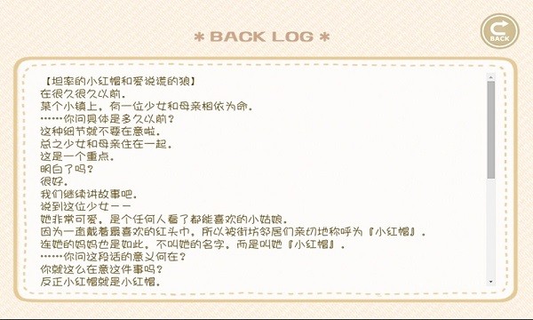 坦率的小红帽和爱说谎的大灰狼手机版是根据经典童话寓言故事改编而来的剧情游戏,采用卡通画面渲染呈现,还原熟悉的小红帽和大灰狼角色,剧情内容丰富有趣,不同的选择影响不同的结局走向,通过对话展开,操作简单易上手,老少皆宜!