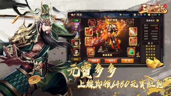 玩家可以为上阵的英雄装备强力的武器、防具、宝物、圣器、神兵、宠物,玩家可以使用征战中获得的材料持续锻造装备获得更高属性,同时玩家还可以根据需要为装备镶嵌宝石或重铸装备,多样的装备极大的丰富了游戏的策略性。武将缘分装备还可以大幅加强技能、属性,打造你的超强本命。