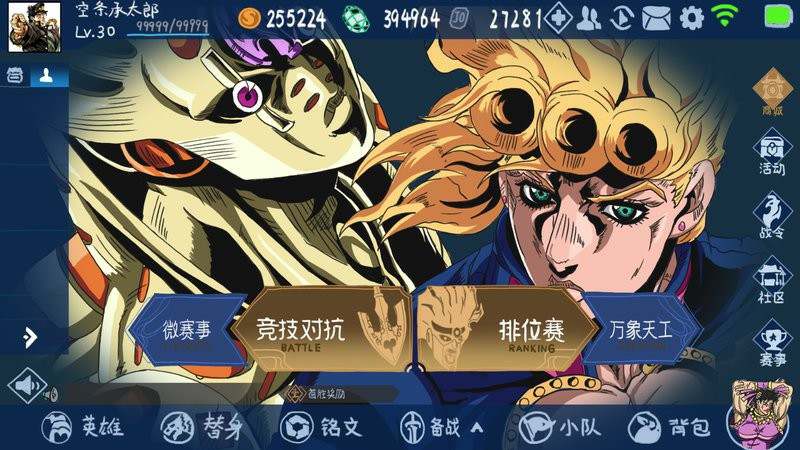 由b站大佬靓仔小白鸽制做的结合jojo的奇妙冒险和王者荣耀的moba同人手游,有着动漫名镜头和小故事!通过任务完成的强化材料和经验值强化角色,向更高难度的任务挑战!让玩家在游戏之中可以体验漫改游戏的乐趣,还有经典的动漫元素在游戏之中。