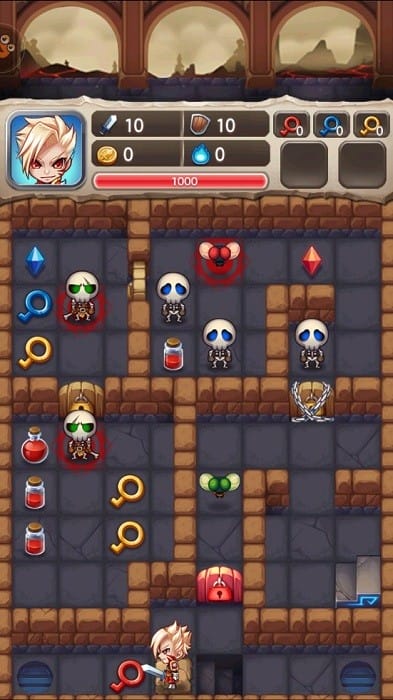 游戏中我们除了依靠智慧和逻辑推理来完成收集钥匙挑战关卡之外,最重要的还是人物的成长过程,玩家们要收集红宝石、蓝宝石来增加角色的攻击和防御,收集血瓶来增加血量等等,通过属性的不断强化来提升自己的战斗力。