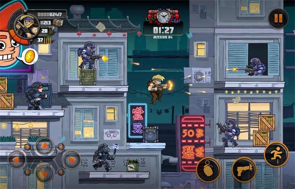 2、进入游戏关卡,通过移动角色,跳跃和攻击,使用不同的枪和手榴弹可以快速的消灭敌人。