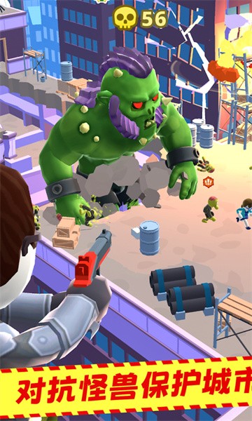 卡通画风的射击类游戏,游戏里有各种强大的怪兽敌人,包括哥斯拉,巨人,海怪等凶猛怪兽。各种怪物将会对城市造成很大的威胁,将其统统的消灭才能让世界和平。作为枪法精准的神射手,你要使用各种精良的枪械装备对付庞大的恐怖怪兽军团。