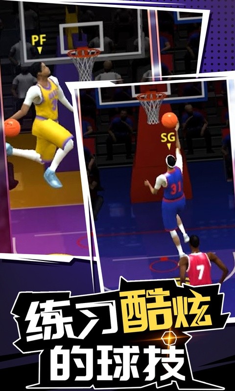 1、游戏采用高清动漫的画面风格,让玩家的投篮,扣篮更加的流畅。
