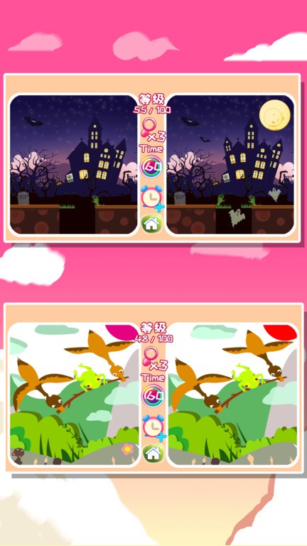 这款游戏的画面设计很卡通,场景丰富,图片种类也很多,适合小朋友长时间玩耍而不觉得无聊。它不仅能锻炼孩子的观察能力、注意力和专注力,还能培养他们的手眼脑协调能力。此外,游戏还加入了提升按键功能,帮助孩子更容易找到不同之处。