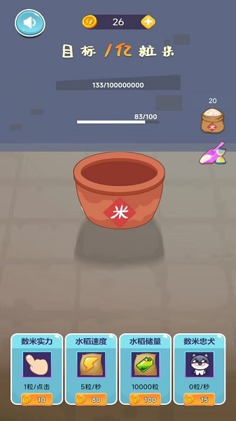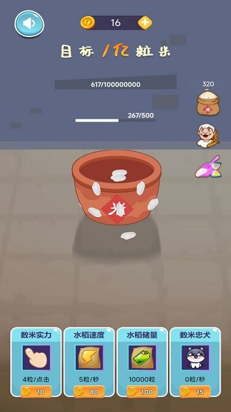 一款以数米玩法为主的休闲游戏,单手点击操作,看你多久能数到一亿粒米,还有宠物前来帮忙,非常解压魔性的小游戏。不断点击屏幕获得大米,也可以利用道具加快进度,轻松完成一亿小目标。