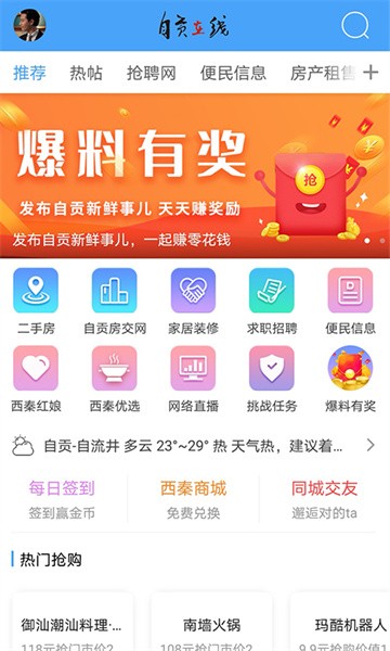参与线上线下聚会。自贡在线客户端是集社交、互动、资讯、服务于一体的移动互联网互动应用,为网友提供吃喝玩乐衣食住行等信息,您可以随时随地分享资讯到微博、微信、qq空间等社交应用,并参与评论互动。
