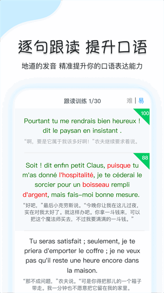 智能实时口语评分,逐句跟读逐词打分,助你攻克“开口”难关;