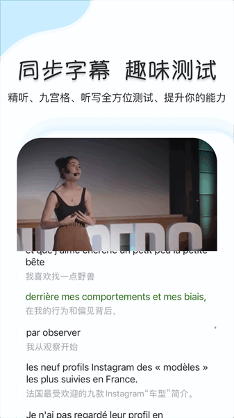 特别是离线模式,可以下载很多内容,随时随地都能学习,这点我觉得很赞!有时候坐地铁或者等公交车的时候,就能偷偷学法语了。它还有很多有趣的互动游戏,比如九宫格听力练习,这样学习不会太枯燥。而且更新日志里提到了优化划词功能,以后查单词应该会更方便。
