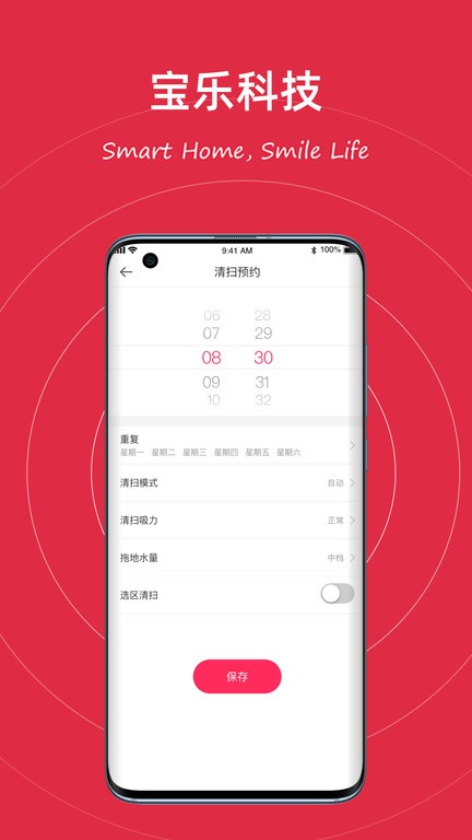 宝乐科技手机版连接扫地机的一个智能家居软件,用户可通过app来远程遥控设备的使用,通过简单操作即可快速设置清扫范围,全方位来清洁房屋的各个角落,支持定时预约、设置楼层记忆等人性化操作。
