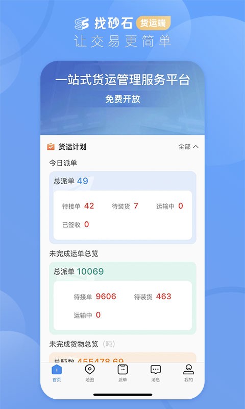 【首页】可以统计今日派单(总派单,包括待接单、待装货、运输中、已签收)、未完成运单总览(总派单,包括待接单、待装货、运输中)、未完成货物总览(总派单,包括待接单、待装货、运输中)等。