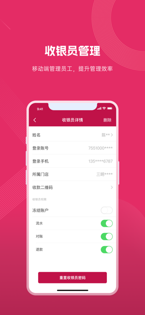 4、多账户管理:可添加多个收银员账户,实现收款统一到入商户账户,灵活配置权限。