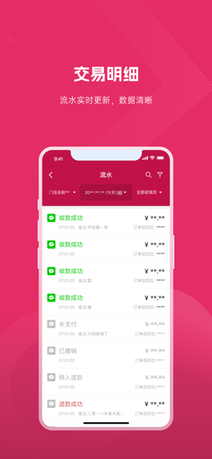 5、账单查询:查询交易订单状态,多维度分析收款情况,实时掌握经营状况。