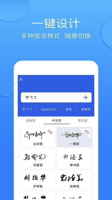 一笔签名、公文签名、动画签名、英文签名、潇洒签名、卡通签名等几十种签名样式随意选择,支持多种风格样式签名设计。