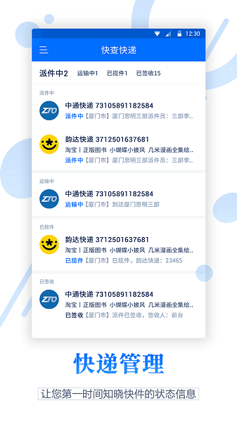 4、支持快递管理,在线统一管理派件中、运输中等类型的所有快递;