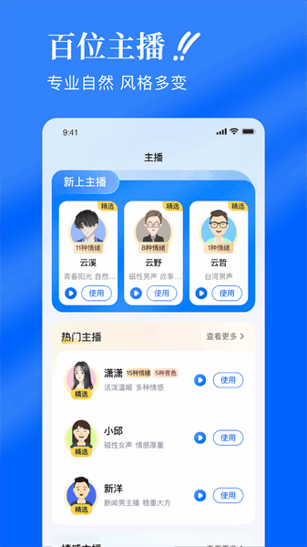 千千配音是一款专注于文字转语音的智能语音合成软件,采用强大的语音合成技术,打造简单高效的配音服务平台。拥有百位不同的主播,支持普通话、英语、粤语、四川话、东北话、湖南话、台湾话等多个音色。更有众多真人广告促销成品录音,一键导出。满足您的配音需求。