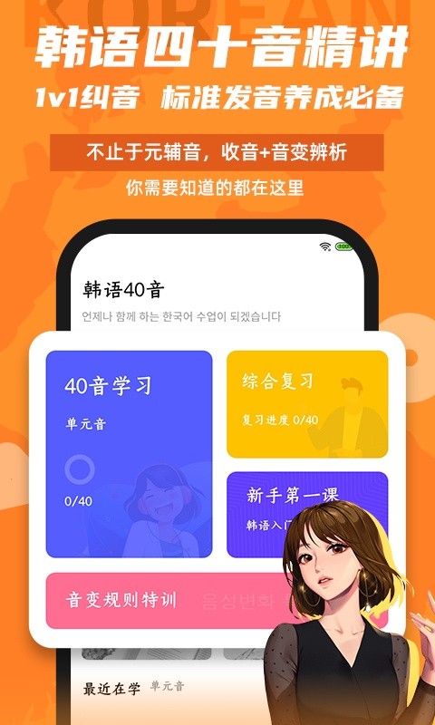 2、韩语必学的四十音可以在此统一学习,不管是元音还是辅音、音变、拼读都能掌握;