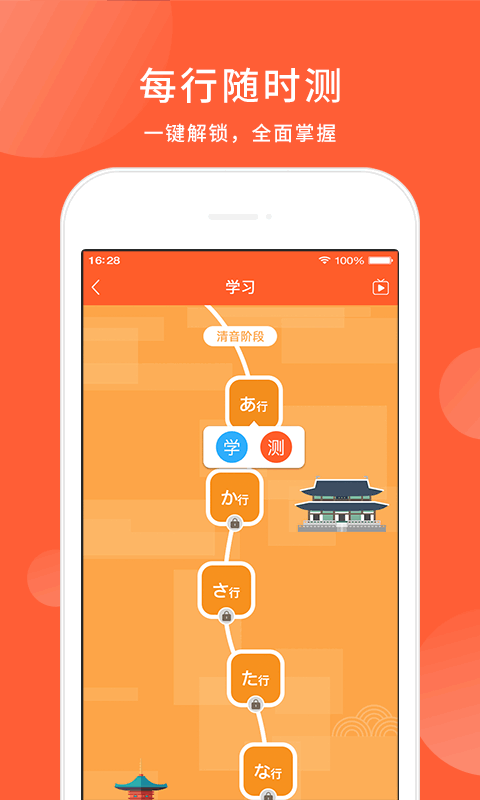 每行随时测,一键解锁,104音循序渐进的掌握;阶段测试,检测日语学习成果