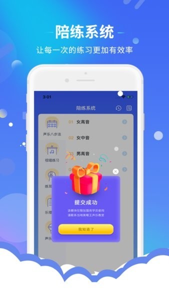 --陪练功能分为视唱练习、练耳练习、乐理练习、声乐练习,细化练习科目精确分类,让每一次的练习更加有效率。