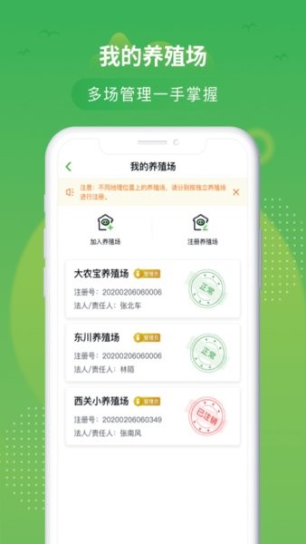 支持多个养殖场查询和切换,统一管理,信息一目了然,业务办理内容和状态详尽。