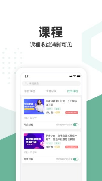 口才喵行家端app专为专家用户打造,专家可以在手机上发布自己的课程,公开以后会让学员能够及时看到,约课信息一目了然,可以根据自己的时间自由排课,上课时间灵活自由,收益实时可查,每堂课都有详细的平台津贴展示!