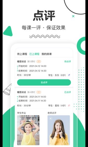 敢说,能说,会说,立足语言思维,营造标准交流语境,言谈举止间,让每个孩子把握未来人生。在完成当堂课程后,教师可在平台进行学生学习点评,课后作业点评等,精准把握学生的课堂学习状态,了解课程学习情况,高效辅导学生进行口才练习。