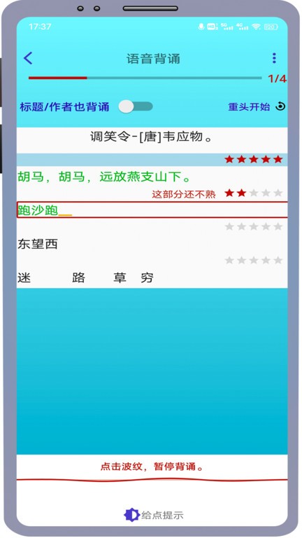 支持对古诗词进行点读和意思讲解,让用户在理解诗词意思的基础上再背诵,而不仅仅是死记硬背,这样才能记得快、记得牢。